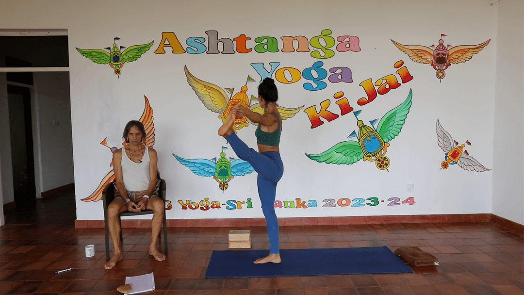 List of asanas: Surya Namaskara A (3x) Surya Namaskara B (3x) Padagusthasana Trikonasana Parsvakonasana Prasarita Padottonasana A Utthita Hasta Padangusthasana Dandasana Pashimottonasana A & B Janusirsasana A Marichyasana C Navasana Baddha Konasana A & B Urdhva Dhanurasana Pashimottonasana Ujjayi Breathing in Padmasana