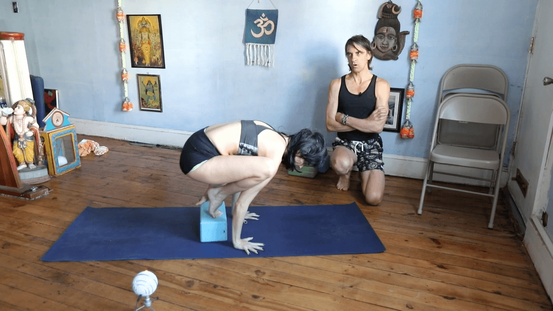 This class advances Bakāsana (Crane Pose) by drilling the essentials: stay compact, hips and heels never separating, and keep the thighs horizontal rather than tipping vertical Bakasana Class 2 . Begin on blocks with heels lifted, squatting deeply so the knees wrap high around the arms. From there, slot the arms carefully, plant the hands, and practice rocking forward and back with big rhythm—weighting the arms each time without letting the hips rise independently. Progressions include: Toe lifts — rock forward, point one toe, then the other, eventually both, while bracing arms. Full lift — raise feet, spine, hips, and head together like an elevator, finishing with dome-shaped upper back. Jump-ins — from a deep crouch, suck knees and thighs forward, landing softly in the compact shape (never jumping up or down onto the arms). The focus is on proportionate lift and precision: everything rises in harmony, legs squeezing in, arms stamping the ground, spine rounded but buoyant. The result is a repeatable, strength-building pathway to a stable Bakāsana.