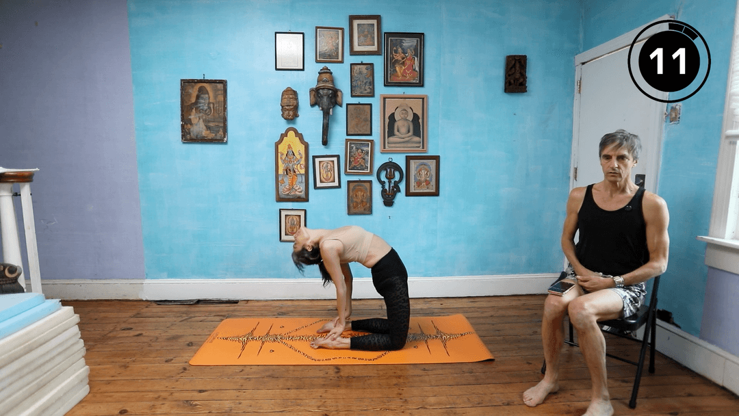 This three-part kneeling backbend circuit strengthens the entire backside of your body through dynamic Ustrasana transitions, a plank-style Laghu Vajrasana prep that leans back without collapsing, and a bold head-first “back dive” dropback drill with hands stamped together at the chest. Each exercise is done for 30 seconds with a 30-second meditative rest, repeated for three rounds. Root your shins, ankles, and feet, open your chest, tone your legs, buttocks, and abdomen, and work with steady ujjayi breathing to circulate prana and awaken the spine. Options are given to tuck the toes, keep the head higher, or make the movement smaller, so you can scale the intensity while building strength, rhythm, and a courageous relationship with kneeling backbends. This drill develops: Ustrasana, Laghu Vajrasana, Kapotasana, and dropping back to Urdhva Dhanurasana with confidence and control.