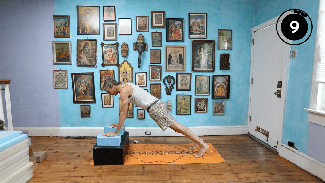 This elevated “high station” plank circuit lets you build serious arm, shoulder, core, and leg strength without overloading your joints. Using a bench, blocks, or any sturdy surface, you’ll cycle through three timed drills—thigh-to-chest leg drives, alternating shoulder taps, and full plank-to-chaturanga push-ups—for 30 seconds on, 30 seconds off, repeated for three rounds. The higher station reduces weight-bearing so you can repeat what you want to reinforce: a steady danda line from head, torso, and pelvis, minimized swaying, and clean elbow flexion in push-ups. Between sets, you reset with simple pranayama-style breathing to feel the energy you’ve opened. This circuit is ideal as a strength supplement for jump-backs, headstand transitions, and solid chaturanga, and can be scaled by adjusting speed, intensity, or number of rounds. **This drill develops:** Plank, Chaturanga Dandasana, jump-backs, jump-throughs, and the upper-body and core strength needed for smooth, powerful vinyasas throughout your practice.