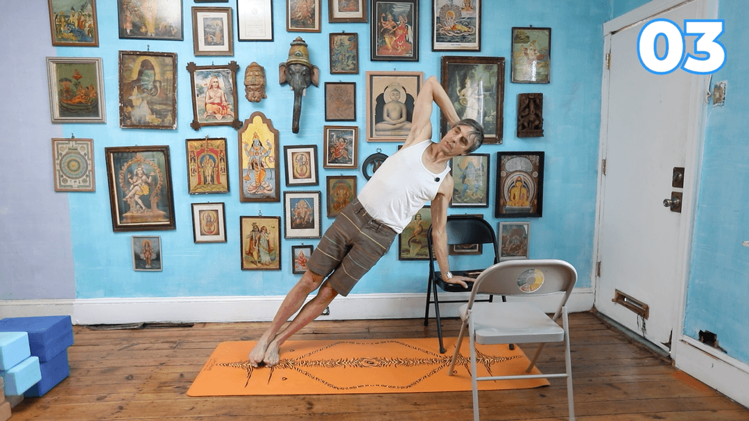 This circuit builds shoulder, arm, core, and leg strength through three side plank drills. Work at high, medium, or low station and cycle through: side-to-side plank swings with precise stops, curl-and-extend side planks (coil in, launch out), and lifted-leg side plank with hand behind head for deep curl and extension. Do 10 reps per side for each drill, repeat for multiple rounds, and rest in seated meditation between sets. Focus on keeping head, torso, pelvis, and legs in one clean line—curl is your crouch, extension is your spring. **This drill develops:** Side plank strength, core stability, and the shoulder control needed for plank, chaturanga, jump-backs, and inversions.