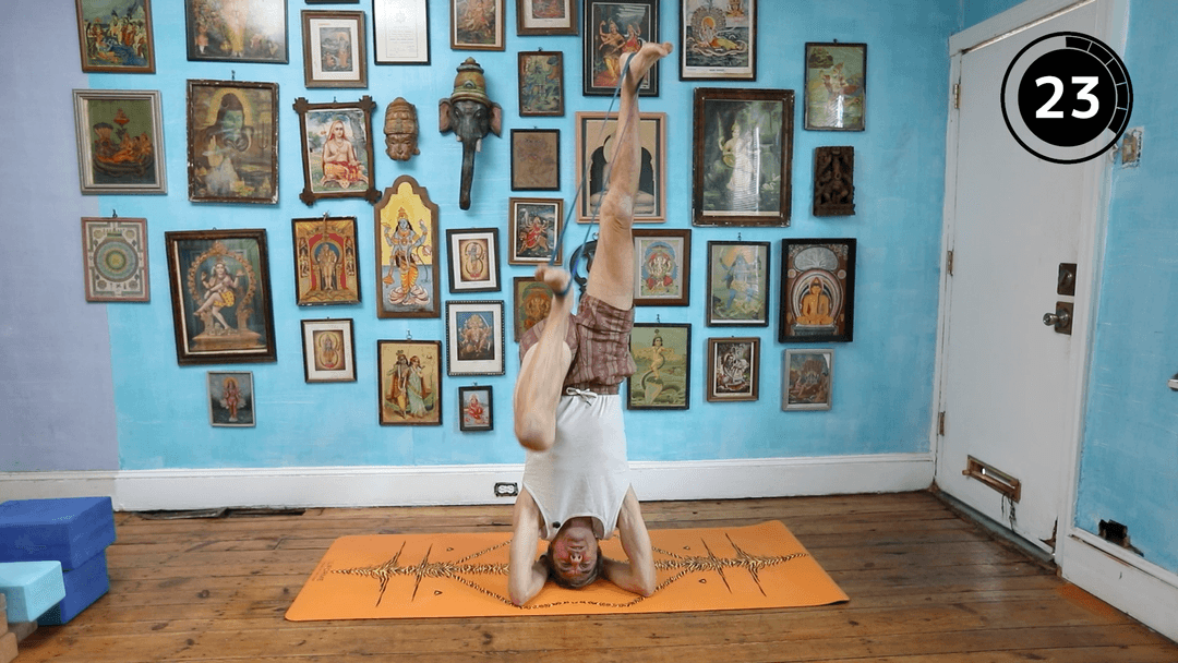 This circuit uses three resistance bands (heavy, light, extra light) to build headstand strength, control, and balance. You’ll do three rounds of 30-second drills with 30-second rests: static headstand pressing into the heavy band, thigh-to-chest mountain climbers with the light band, and wide-leg travel with the extra-light band. Work at the wall if needed and keep weight in your arms while the bands activate your legs. **This drill develops:** Sirsasana strength, core control, leg engagement, and balance for stable inversions.