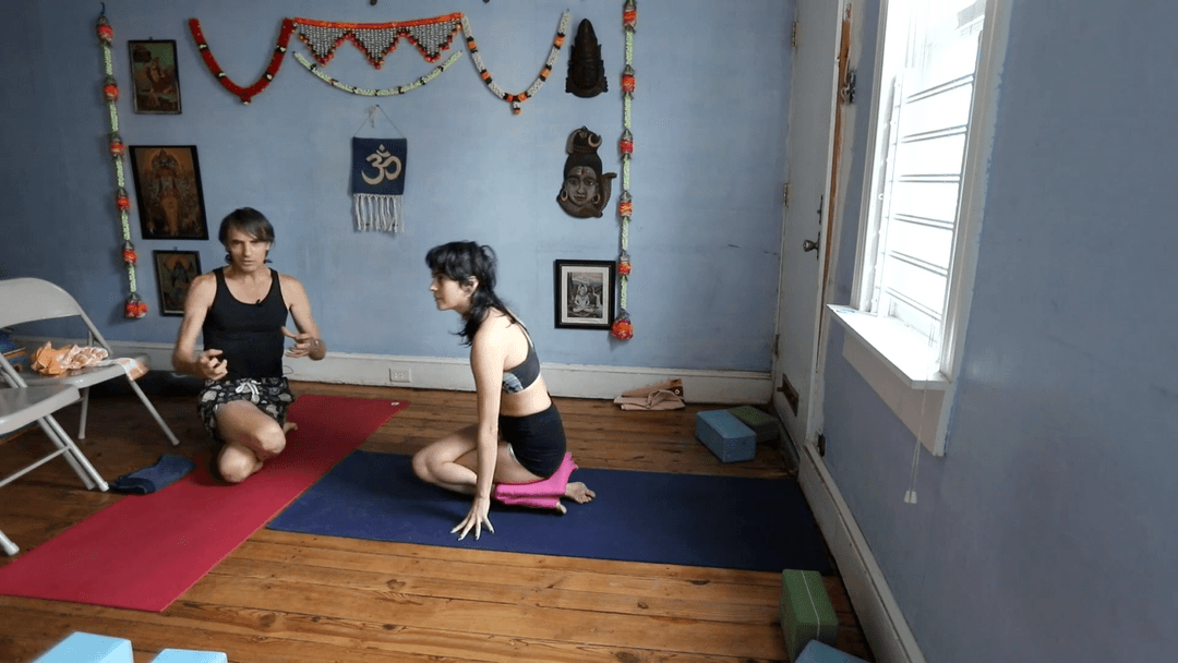 This class explores Gomukhāsana (Cow-Face Pose) beginning with the root transition: jumping to kneeling, then crossing one leg over the other and driving the thighs forward into the seat. Props like padding under heels or ankles can support the setup when needed. The posture is reframed as a dynamic ride—like the stone-carved yogis riding fish in Hampi—revealing Lotus as a position on the edge of imbalance, not inert stillness. Students are encouraged to embrace the awkward foundation, grounding deeply through the lower body before expanding upward. Once seated, the work shifts to foundation plus arms: clasping the knee and pulling strongly to awaken lift from the pelvic floor upward. Arms then extend or bind, with careful attention to shoulder placement (arm behind the head, not in front) to create real shoulder opening. Bandhas are integrated with breath—Mūla and Uḍḍīyāna lifting, Jālandhara added as the chest expands. The essence: Gomukhāsana is not just a twist but a hatha yoga meditation seat, where instability, grounding, and bandha activation combine into a buoyant, alive foundation.