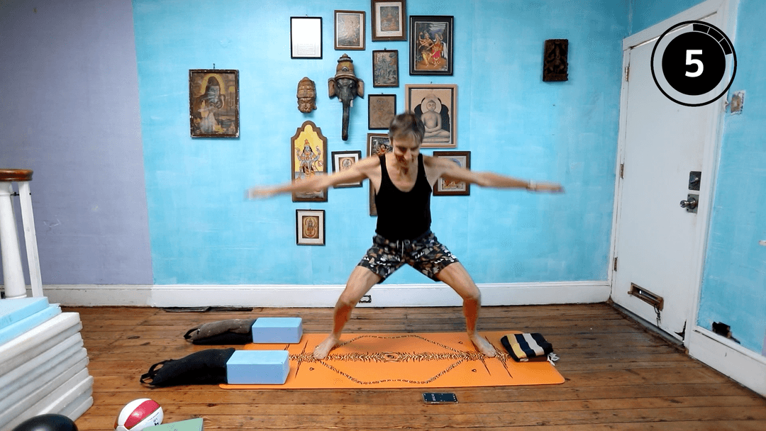 Three jump exercises in 20-second rounds: Fierce Jumps from Uttanasana, Half-Squat Jumps, and the standing pose jump transition. Jumping strengthens bones, raises heart rate, keeps you springy. We repeat the transitions with attention and rhythm. Build explosive power, leg strength, cardiovascular fitness.