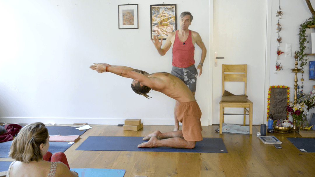 This class develops Laghuvajrāsana with clear halfway points and introduces the pathway toward Kapotāsana. We begin by moving back only as far as catching the legs with arms extended, never forcing the head to the floor. Students practice two styles: lowering all the way and returning, or stopping at the halfway point to stabilize before continuing. Props like blocks or a wall are added to customize height and create safe, repeatable stations. From there, we explore head-to-wall variations—using gentle contact for orientation when the depth isn’t yet available. Arms become extensions of the spine, pulling the chest open as the head and spine follow their lead. The focus shifts from thinking “down” to moving up, out, back, then down, keeping the action expansive and alive. Finally, the class links Laghuvajrāsana to Kapotāsana prep: Namaste palms guiding the descent, arms committed fully, chest broadening to support the spine’s arc. The practice becomes a lesson in trust and confidence—learning to rely on the sequence of steps rather than doubt. The takeaway: backbends grow not from forcing depth but from trusting halfway stations, arm commitment, and gradual transitions that reveal strength and openness. Model - Romain Prevost