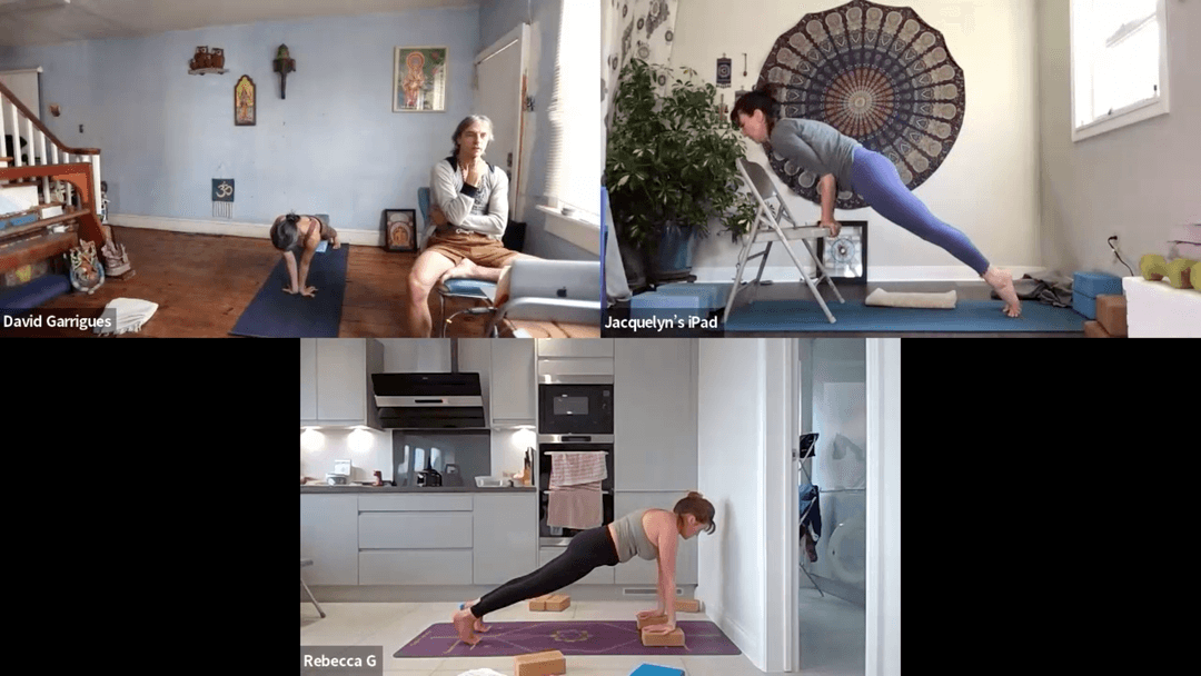 This class continues the study of Mayūrāsana (Peacock Pose) with new options for support and entry. We begin with the reverse-hand plank and chair drills: hands turned back, arms steady, belly on the elbows, and one leg at a time lifted to practice balance . A belt above the elbows may be added to stabilize if arms need spacing due to carrying angle. From there, students step onto block stacks at the wall, refining leg lines and gradually lowering support as strength builds. Two alternative approaches are introduced: Lotus entry — placing legs in Lotus first makes them shorter, giving a small advantage in lifting into balance. Frog-like Mayūrāsana — knees wide, torso rounded, elbows in belly, then straightening one leg and then the other to find lift. These variations are presented as supplemental—not shortcuts—helping students explore different pathways into the pose. The essence is clear: Mayūrāsana can grow from plank discipline, Lotus dexterity, or primal frog-like grounding, but in every case it requires forward commitment, whole-body participation, and patient layering of drills.
