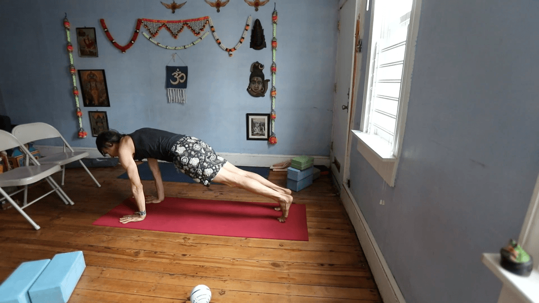 This class develops Nakrasana (Crocodile Jumps) as a demanding plank variation. We begin in plank itself, reinforcing why Nakrasana is a “plank family pose”: the priority is holding the Danda line—head, torso, pelvis, legs strong like a crowbar. From this base, practice small jumps in place while keeping the body one stiff unit. The “big four”—quadriceps, hamstrings, abdomen, buttocks—must stay contracted so the hips never rise separately. Next, explore forward/back hops and progressions onto the forearms, where maintaining the plank shape becomes even harder. Height of the jump is irrelevant; integrity of the line is everything. Finally, add Chaturanga jumps: elbows bent before, during, and after flight, with no change through the arms. The key lesson: Nakrasana is not about flashy leaps but about discipline and repetition—jumping while never leaving the plank or Chaturanga shape. This builds stamina, rhythm, and whole-body strength.