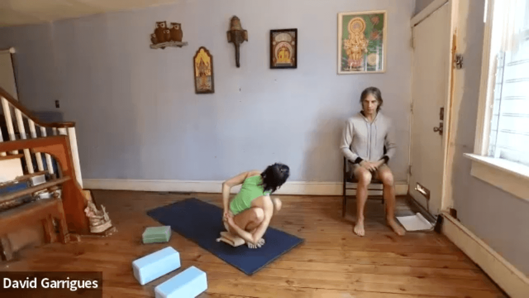 This class explores Pasāsana as the root of Second Series. Begin by customizing your squat—heels lifted as needed—to find the true middle: hips fully down, weight forward in the feet, spine upright. From this foundation, add spinal rotations with arms clasped or outstretched, then progress into modifications (block leverage, single-leg binding, strap assist) before attempting the full pose. Emphasis is on spinal rotation over binding, grounding through legs and feet while twisting evenly from base to crown. Class closes with Second-Series vinyāsa work: compact lift-ups from squat with crossed or uncrossed ankles, practicing the “crux phase” of the jump-back to build strength, steadiness, and confidence.
