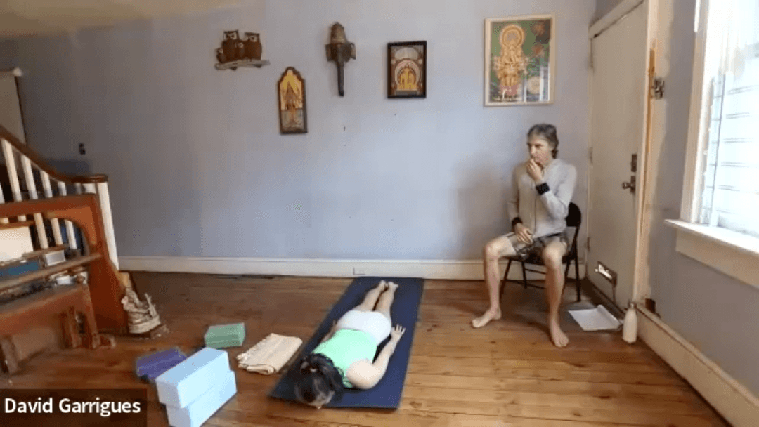 This class develops Śalabhāsana (Locust Pose) as a study in foundations and balance. Begin with vinyāsa drills (Down Dog → Plank → Chaturanga → Up Dog) to build Second Series strength, then shift to belly-down work where the abdomen is the base. Train the “old-fashioned scale”: chest lift and thigh lift in equilibrium, belly as the fulcrum. Prioritize thigh activation before chest lift, using single-leg kicks, alternating extensions, and both-legs-together drills to awaken leg power. Props (pelvic support, wall block under feet, step-up block ladder) give advantage without sacrificing alignment: kneecaps facing down, legs internally rotated, adducted, and braced. The aim is not height of the feet but full leg extension and energetic balance—legs as brilliant as chest. Transitions and holds are repeated to reinforce the mantra: legs first, then chest—until both rise together in the middle.