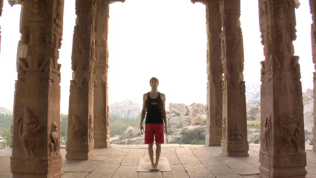 Practice Surya Namaskara A with the traditional Sanskrit count, focusing on the nine positions, the rhythm of the breath synchronized with sure movement, without additional instruction or modifications.