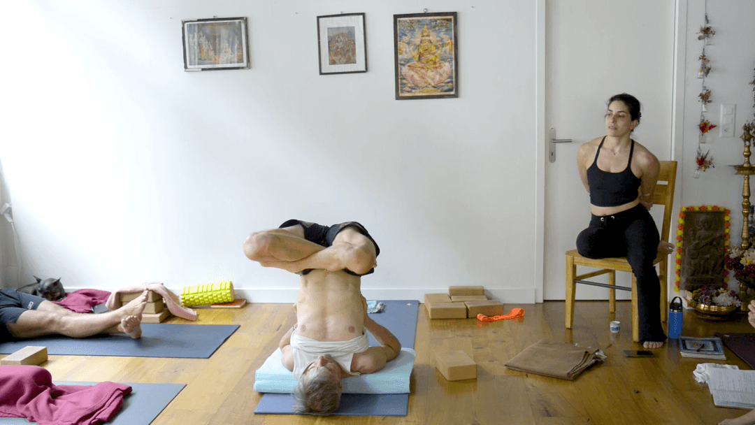 This class explores how to take Lotus while upside down with safety, clarity, and full-body action. Begin by practicing the essential “little move”—lifting and rotating the foot toward half Lotus—first seated, then in inversions with pelvic support from blocks. Emphasis is on participation: every joint and muscle contributing, avoiding the habit of passively yanking the leg into place. We connect this to the principle that “every pose is Samasthiti in disguise,” searching for shared characteristics across forms. Students try shoulderstand Lotus and headstand variations, learning to keep legs forward, thighs positioned in advance, and gestures faithful even when the full bind isn’t yet possible. The class closes with an inversion of choice and a group chant, leaving you with both technical steps and a devotional sense of practice.