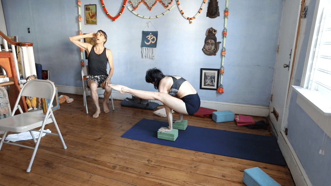 This class builds Tittibhāsana (Firefly Pose) from the ground up. Begin with a forward jump, feet landing outside the arms, then slot the thighs high—up toward the shoulders, not just the elbows. First balance with bent legs (like Bhuja Piḍāsana without crossing), then drill one-leg power kicks: extend the leg straight like a cannon shot, lift the hips, then switch sides before kicking both forward together into the pose. Blocks under the hands add height and space. Next, refine the classic diagonal angle—hips slightly down, feet lifted, spine rounded—before exploring variations. Work jumps forward with eagle-like legs (no upward motion, all forward), train soft landings, and reset the legs higher on the arms each time. Finally, explore walking versions: wide stance, arms slotted, stamping the feet, and stepping nimbly to build dexterity and endurance. The focus: Tittibhāsana as a practice of slotting, projecting brilliance through the legs, and flowing rhythmically between entry, hold, and exit.