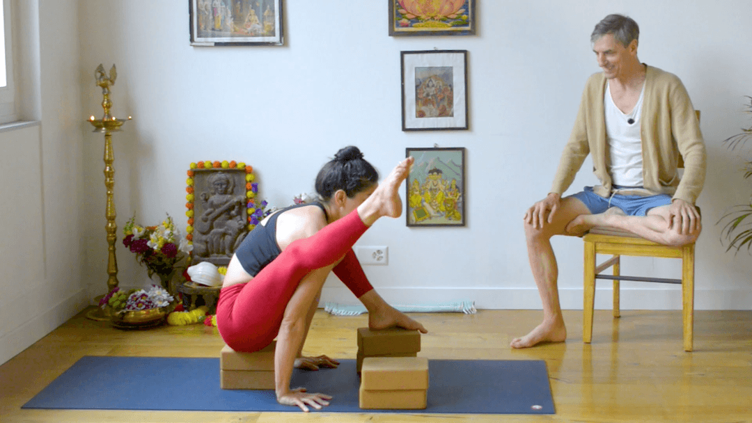 This class explores Tittibhāsana (Firefly Pose) step by step. Begin from Down Dog with a forward leap, placing feet outside the arms and slotting the thighs high up the shoulders. From there, practice the classic shape—legs extended forward, arms straight, hips at a medium diagonal—before exploring variations: Tittibhāsana B — a seated forward fold variation, clasping hands behind the back and extending the legs. Walking version — shift weight forward and back, stepping lightly while keeping the legs extended for dexterity and nimbleness. Tittibhāsana C — feet closer together, turned slightly out, arms wrapping in front of the ankles, head through the shoulders, hips lifting. Drills include alternating one leg bent/one leg extended, experimenting with hip height (low, medium, high diagonal), and practicing with hands on blocks for extra lift. Wall support is suggested for refining B and C, with ties or straps to help those who can’t fully extend the legs. Exits link directly into vinyāsa: swing back, extend the legs, and jump to Chaturanga, connecting Tittibhāsana to the flow of the sequence. Model - Delara Tiv (Ashtanga Vevey)
