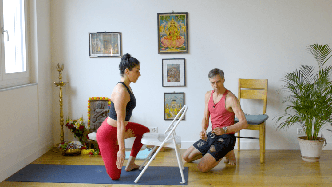 This class studies Vatayānāsana (Horse Pose), a rare Second Series posture combining Half Lotus with balance and hip opening. We begin by learning the flip into Half Lotus, folding forward, then jumping back while keeping the Lotus foot and knee lifted off the ground in Chaturanga, Up Dog, and Down Dog. From there, we explore the setup: either with Half Lotus or a simpler open stance if Lotus isn’t available. The key is grounding the legs, externally rotating the hips, and keeping the torso upright rather than collapsing forward. Students practice upright balance drills—tucking the tail, lifting through the navel, and stabilizing even in the unstable stance. Arm variations include raising both arms vertically (meditation style) or crossing the arms in front while resisting rib flare, which strengthens the shoulders and spine. Props such as knee padding, a wall, or chair support are used to make the unstable position accessible and safe. The takeaway: Vatayānāsana is less about rushing to a five-breath hold and more about researching the stance, balancing the pelvis, and integrating arms and shoulders to turn a tricky, unstable shape into a grounded meditation in action. Model - Delara Tiv (Ashtanga Vevey)