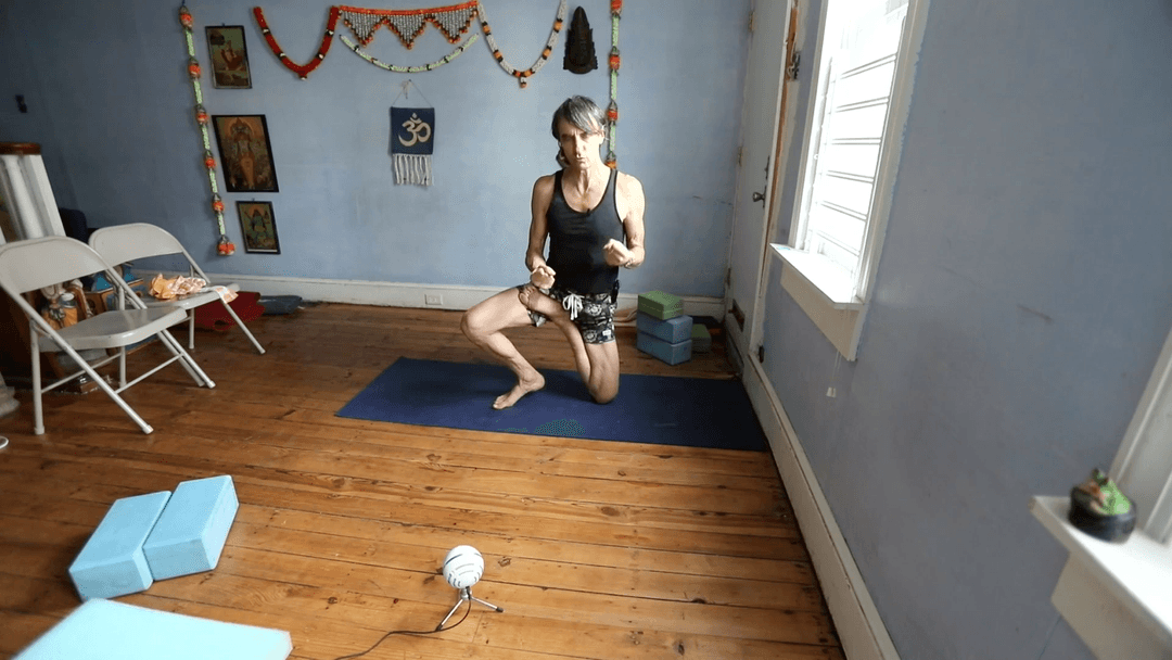 This class explores Vatayānāsana (Horse Pose) step by step, beginning with Half Lotus placement at the wall. The supporting leg is externally rotated like a frog leg, heel heavy on the floor whether lifted or grounded. Students first focus only on the foundation—upright torso, lengthened tail, and lifted navel—before adding arms. Two Half Lotus variations are discussed: one where the heel is drawn toward the navel, and another where the foot rests in the groin crease with the knee rotated outward. The second version, though more awkward, is the one suited for this pose. Props like wall support or extra knee padding are encouraged, especially at the start. Once upright balance is established, the arms are added: reaching high overhead, then practicing the forward flip movement while keeping as vertical as possible. The non-Lotus foot can be walked closer in to increase challenge. The takeaway: Vatayānāsana is not rushed but researched through Half Lotus dexterity, upright stability, and stepwise arm work, turning an awkward stance into a steady balance.